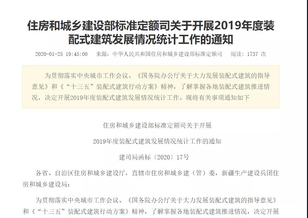 2020年1月25日,住房和城鄉(xiāng)建設(shè)部標(biāo)準(zhǔn)定額司關(guān)于開(kāi)展2019年度裝配式建筑發(fā)展情況統(tǒng)計(jì)工作的通知,內(nèi)容強(qiáng)調(diào):